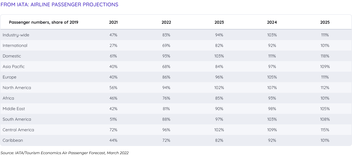 Clearly, the industry has reason for hope: After dining out, travel is the second thing people most wanted to spend money on when a lockdown ended. The fortunes of all segments of the travel sector are projected to improve. Rate Genius projects the car rental industry will not only recover but beat out 2019 rental numbers with estimates at 46.8 million in 2024 and 49.2 million by 2025. The Cruise Lines International Association (CLIA) forecasts that passenger numbers will not only meet but exceed pre-pandemic levels by the end of 2023.